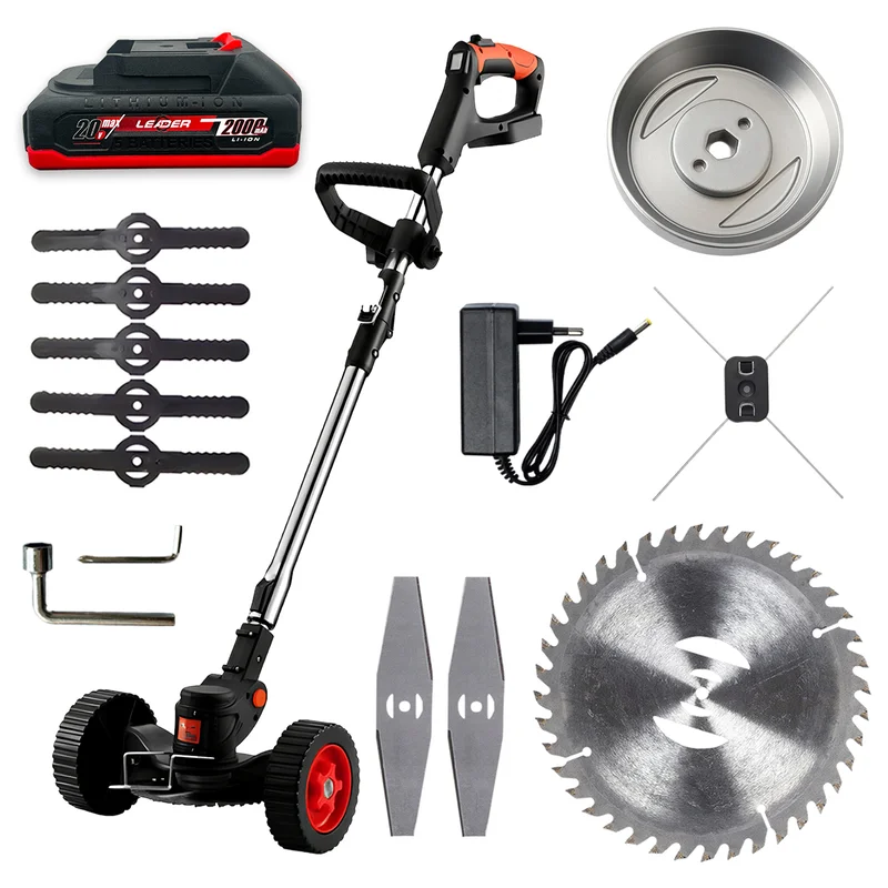 Комплект включає пластикові та металеві ножі, що дозволяє ефективно підстригати газон і підтримувати порядок на присадибній ділянці. Знімні колеса забезпечують зручність роботи на рівних поверхнях, а захисна рамка допомагає уникнути пошкодження рослин.